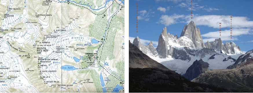 Le sommet principal, le mont Fitz Roy (3405 m), aujourd’hui rebaptisé El Chaltén (du mot «Mapuche» des Indiens Tehuelche, qui veut dire « montagne qui fume »), a été gravi en Février 1952 par les Français Lionel Terray et Guido Magnone. Il est entouré d’aiguilles (Agujas) dont certaines ont reçu pour noms Aguja Guillaumet (2579 m), Aguja Mermoz (2732 m), Aguja Saint Exupéry (2558 m).