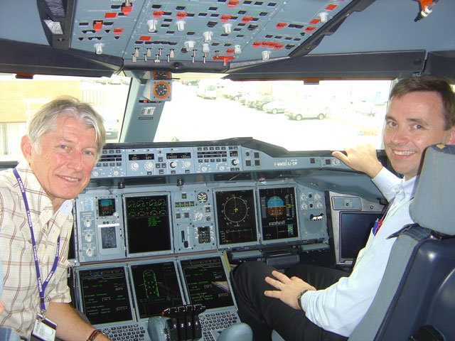 Jean Louis au cockpit de l'A380, avec Hughes Van Der Strichen pilote d'essai expérimental chez Airbus |
