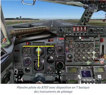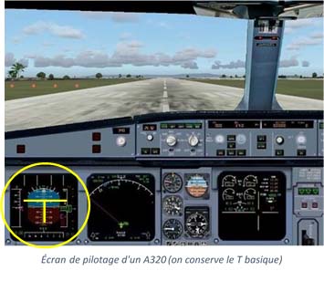 Les paramètres de base de la trajectoire sont la vitesse par rapport à l’air (le « badin »), l’assiette de l’avion (position du nez à cabrer ou à piquer, et position des ailes inclinées ou pas), le cap, l’altitude (l’« alti »), le taux de montée ou de descente (le « vario »). Sur tous les avions de ligne volant dans le monde, ces instruments de base sont disposés de manière standard, sur une disposition en T.