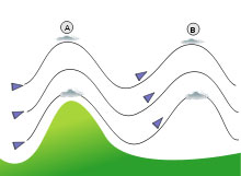 A haute altitude les vents forts épousent le relief sous la forme d’ondes orographiques. Les planeurs en tirent avantage pour gagner de l’altitude, en volant sur la partie montante de l’onde. Les avions de ligne à vitesse de croisière en subissent les conséquences en termes de turbulence. |