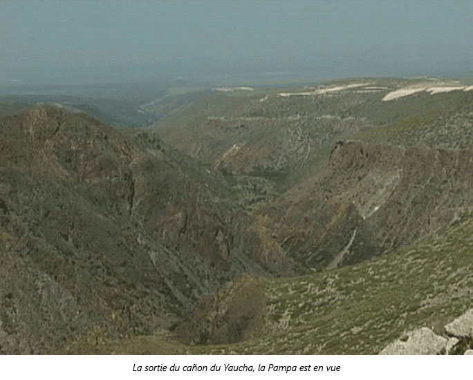 Nous cheminons sur le plateau intermédiaire et devons lutter de nouveau contre des vents terribles. A mi parcours entre le lieu du dernier bivouac et la sortie, bien visible, du cañon du Yaucha, il devient évident que nous n’avons plus de possibilité de redescendre au niveau du torrent. Nous prenons donc l’option de regagner le refuge des gardiens et ainsi de rejoindre la piste. Nous entreprenons alors la montée vers le col (portillo ancho). Montée contrariée par des rafales de vent à nous coucher par terre et à faire une fois encore perdre le moral à mon compagnon. Dernier point de vue superbe sur le cañon baigné d’une brume jaunâtre (il s’avérera qu’il s’agit de fumées provenant des incendies de broussaille dans la pampa). Passage du col. Descente très raide en direction de l’arroyo de la cruz de piedra. A mis hauteur nous apercevons les premiers êtres humains rencontrés depuis 7 jours : Il s’agit des gardiens qui rentrent de la Laguna, où ils ont été déblayer leur refuge. Dernier bivouac au bord de l’arroyo. Nuit très fraîche.