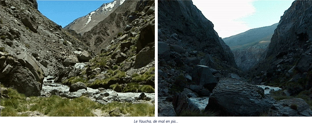 Terrain devenant très difficile, et très lente progression. Mon camarade va manifestement à l’épuisement. Le cours du Yaucha prend des allures de cañon. Il n’y a pas de sentier naturel, la faune ne s’attarde manifestement pas dans les parages (aucun pâturage). La marche se fait au milieu des enrochements et dans les pierriers. Il faut sans cesse évoluer entre la partie basse et la partie haute des berges, bien entendu les dénivelées s’accumulent et les efforts sont significatifs pour assurer le pas sur ce type de terrain. S’y ajoutent quelques traversées du torrent, à gué ou pas… Et celui-ci devient tumultueux. |